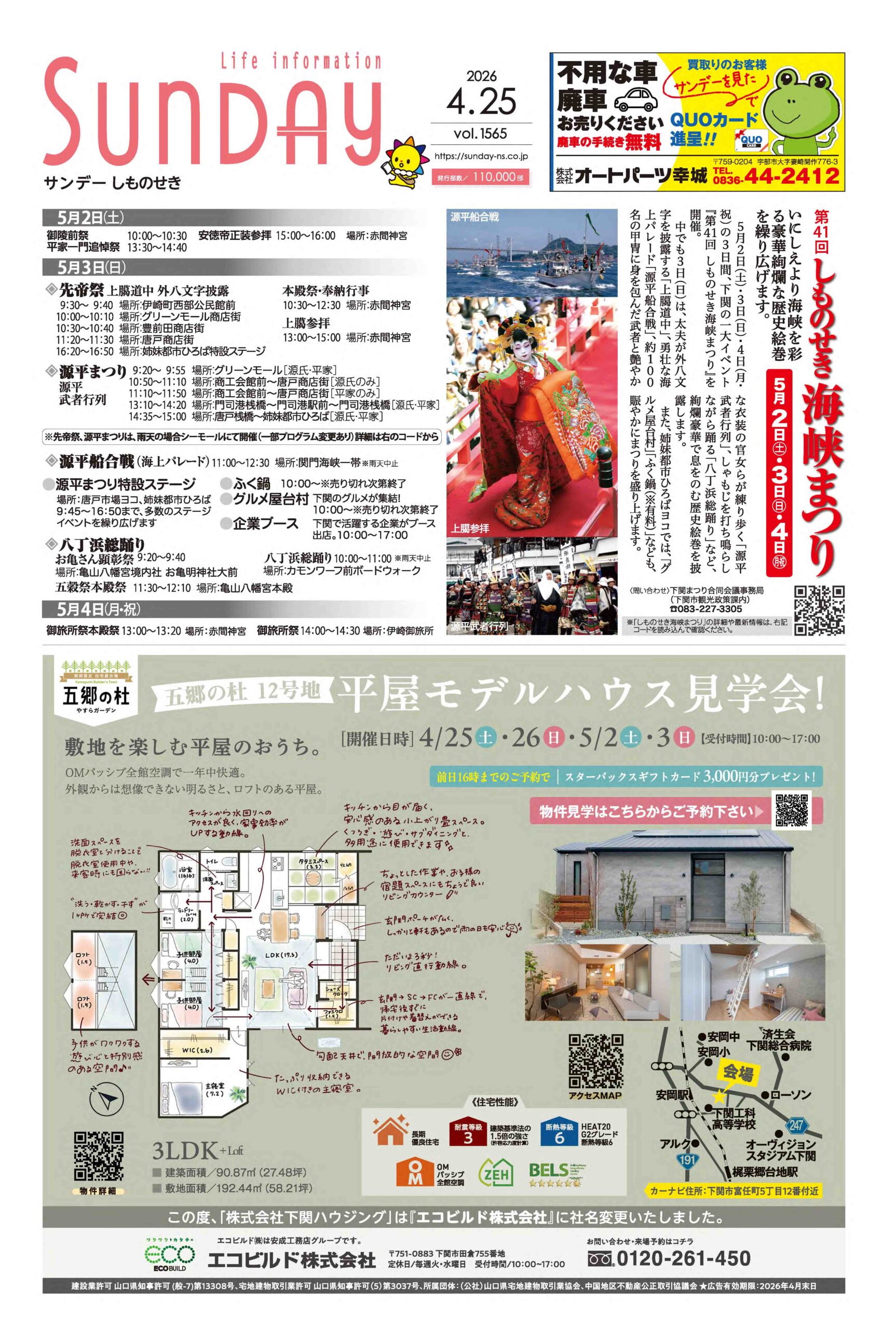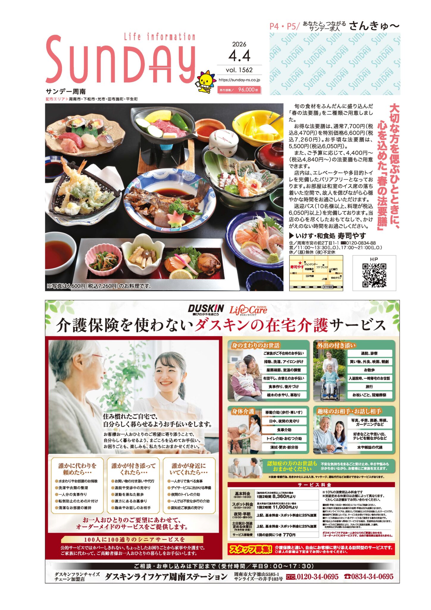 ご挨拶と料金について当社は、毎日新聞のグループ会社として1980年に創業致しました。新聞折込広告業を中心とし、総合広告代理店として時代に合わせ、フリーペーパー事業、ポスティング事業、IT関連事業、生活支援事業など様々な展開をしております。コア事業である新聞折込広告業では山口県を中心に、全国にネットワークを展開しています。2004年にポスティング型フリーペーパーとして生まれ変わった「サンデー下関」は、今では山口県・福岡県においてサンデーネットワークとして11版に拡充、毎週93万部を発行しています。これからも時代や環境の変化に柔軟に対応し、お客様と地域に貢献できる総合企業を目指してまいります。